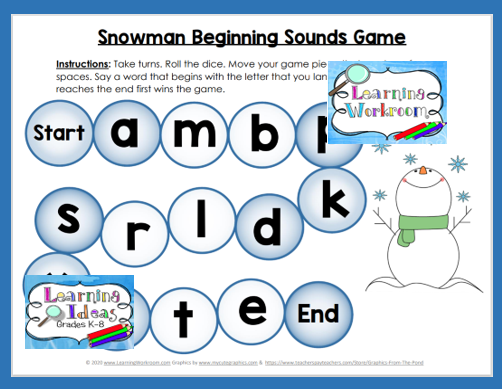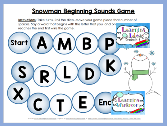 You can print the games for home or school. I made 2 versions. One version has uppercase letters and the other version has lowercase letters. Both free versions are over at my website. Just click HERE to go there to get your copies so that you can print the game. The kids could use dice (1 die) or a spinner to play the snowman themed game and practice beginning letter sounds.