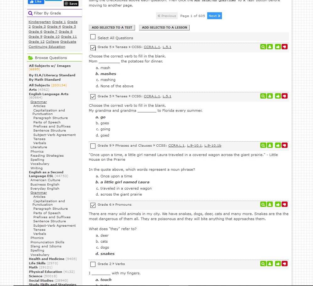 Question options for Grammar Testing |