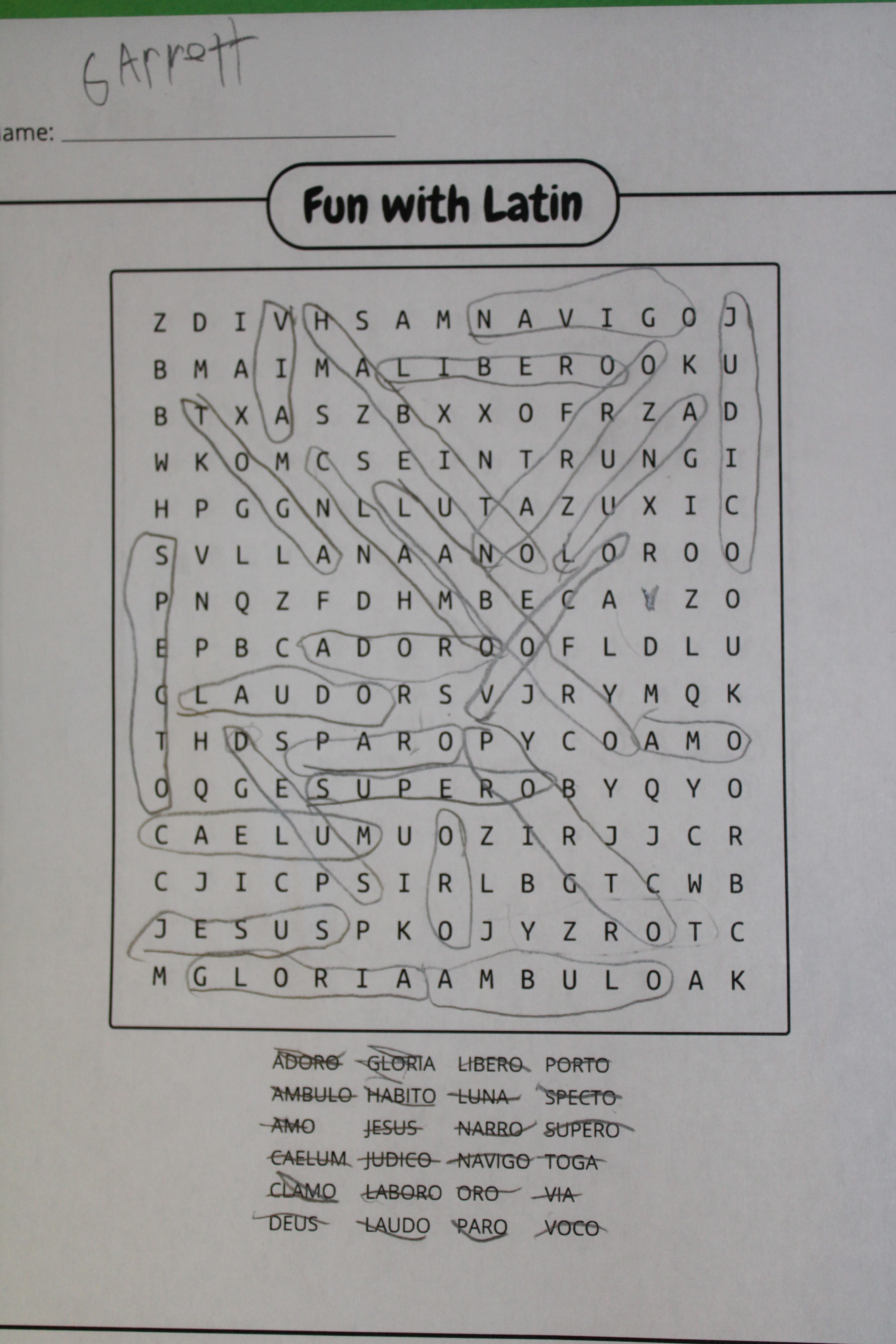 With the bingo cards, I simply add the words I want to use and tell the generator how many cards I want printed. I usually print out 5 cards, one for each day of the week and play a quick round with Garrett where I say the English translation and he finds the Latin words.