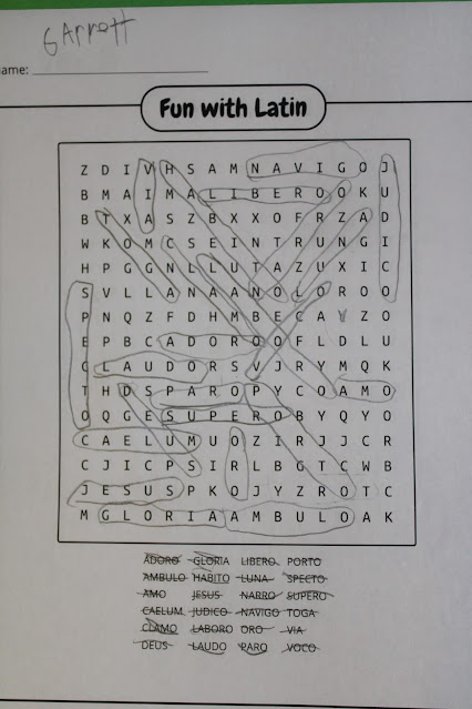 Another way we've used HelpTeaching.com is with their worksheet generator. This is an option that allows you to print out either math drill worksheets or game cards. The game cards are for doing games like Bingo as well as word searches. I really like this function, because it allows me two fun ways for Garrett to practice his Latin words - which helped improve his quiz and test scores for the course.