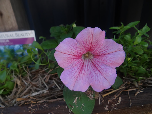 On Saturday I put strawberries, petunias, lobelias and portulacas in the re-purposed wooden crate planter my husband built last year....