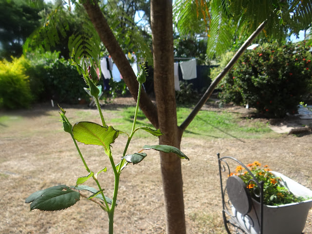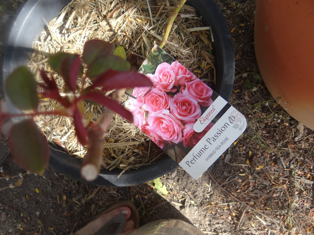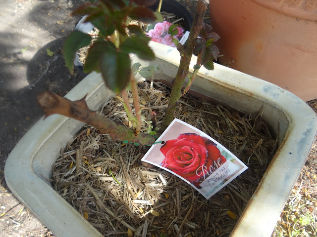My one year old blue rose was pruned back late April but as it just doesn't get cold here, it burst forth with new blooms the next week. Roses bloom all year round for us so I bought two more at the weekend and popped them in pots. The sun is quite fierce here for about eight months of the year and my rose blooms used to fry in the sun, a very sad sight, believe me.