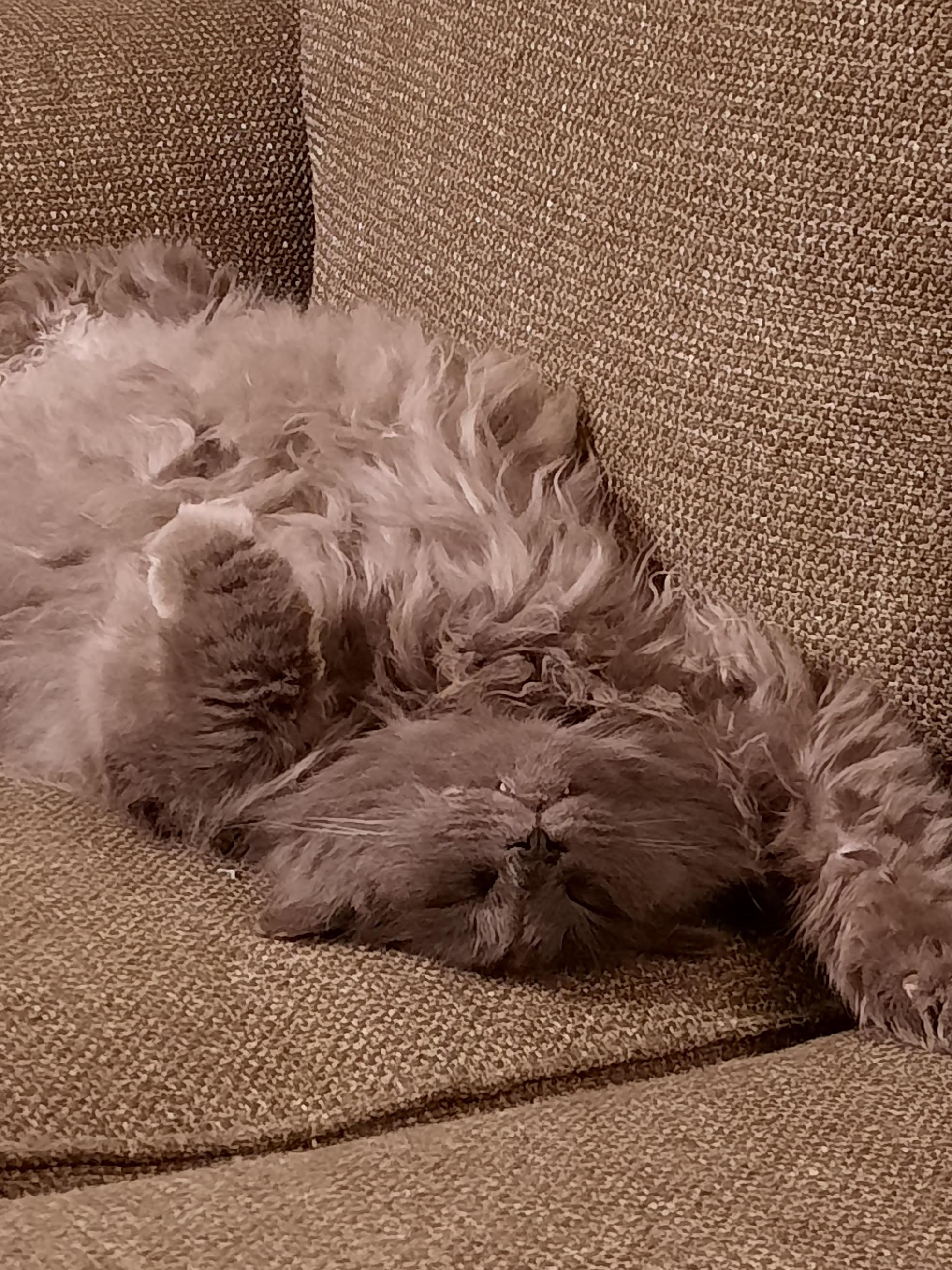 This is one happy kitty. It's hard to imagine, just a few years ago, he was a scrawny kitten that showed up on our doorstep. It took months of feeding him and talking to him before he felt comfortable enough for a few pets. Than one day he crawled into Therese's lap and found a home. He looks pretty comfortably now and definitely relaxed. He's now a fat, lazy house cat that snores!