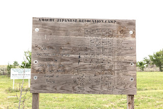 Panorama of Granada Relocation Center, Amache, Colorado, showing in the foreground a typical barracks unit ... consisting of 12 six-room apartment barrack buildings, a recreation hall, laundry and bathhouse, and the mess hall, constructed by Army Engineers. The Center is made up of 30 such blocks, complemented by hospital buildings, adminstrative office buildings, living quarters, general warehouse structures and Military Police quarters. War Relocation Authority photo.