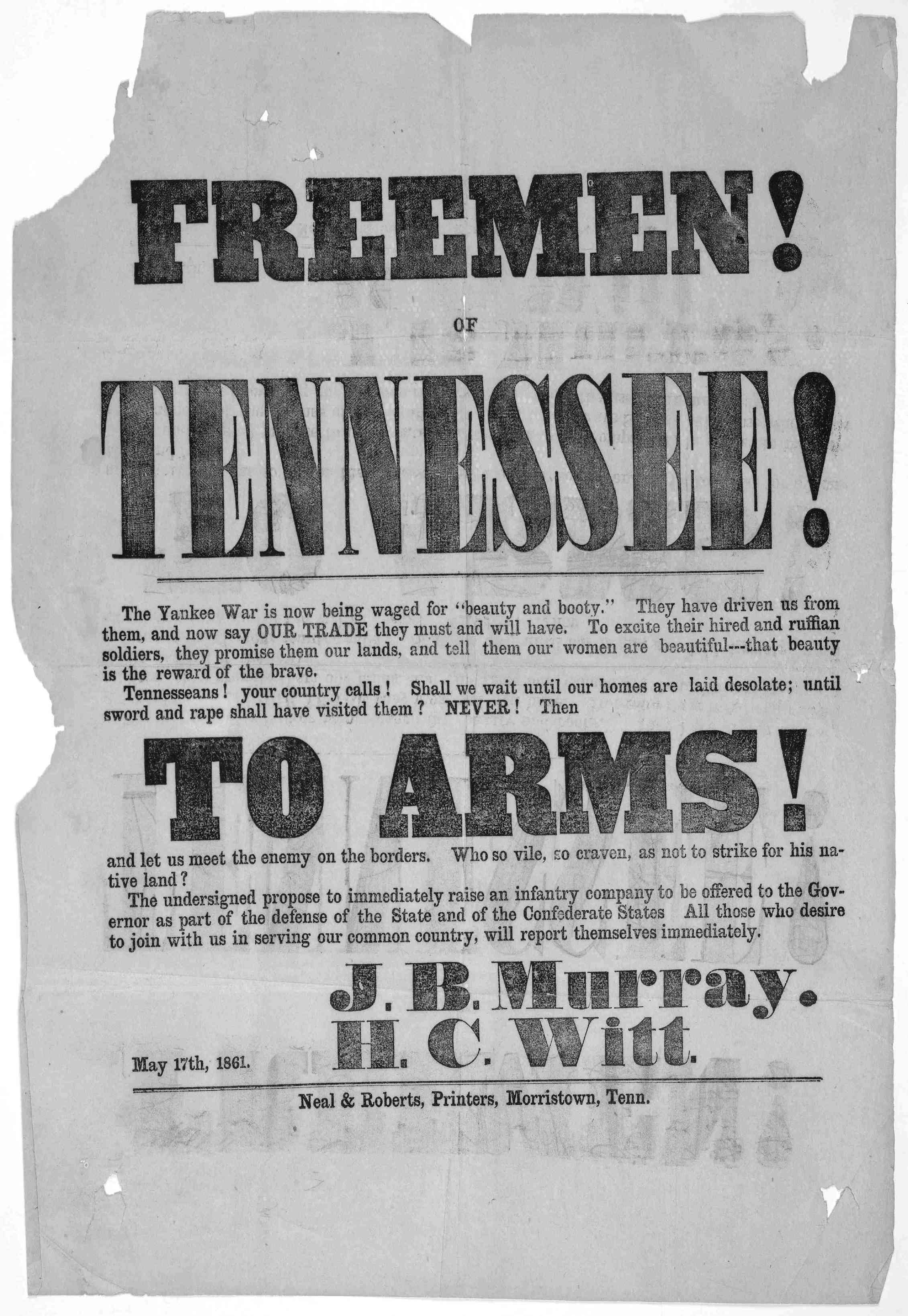 Confederate recruitment poster of 1861: Let us meet the enemy on the borders. Who so vile, so craven, as not to strike for his native land? Library of Congress